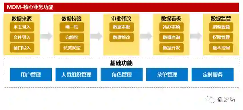 平台对于主数据的管理可分为几大流程:新增流程、修改流程、失效流程、删除流程。所有流程包括数据来源、数据校验、审批修改、数据分发、数据消费这5大环节。