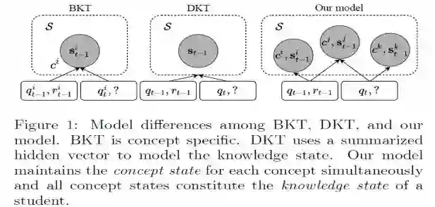 BKT对每个概念建模,DKT将学生知识状态建模成一个总的隐藏向量;