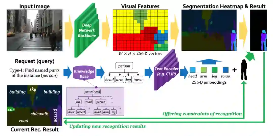 注意,为了完成第 1 类 request,我们需要定义一个知识库(knowledge base,如图 1 右部所示),显式地定义每个视觉概念的部件列表。从严格定义上说,知识库是一个具有拓扑结构的图,具体定义可以参见论文。知识库可以在任何时候被更新(如加入某个物体或者在某个物体上增加部件),而由于按需视觉识别的性质,加入新概念并不需要刷新整个数据集,只需要额外加入若干包含新概念的图片,将其中的新概念标注出来即可。