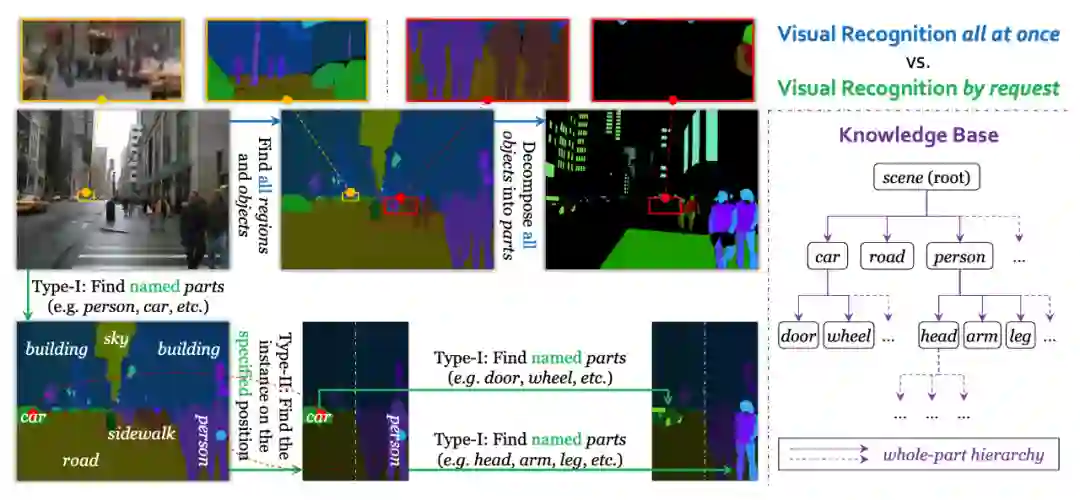 在这个工作中,我们探索了一种走向完整的、无限细粒度的视觉识别的方法,即按需视觉识别方法。它的核心思想在于,不追求一次性地识别图像中的所有物体,而是在基本语义分割的基础上,(按照需求)交互式地处理 request,并且不断细化识别结果。这样做的最大好处,是增加了标注和识别的一致性和可扩展性,从而揭示了完整的、无限细粒度的视觉识别的可能性。