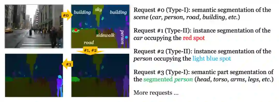 按需视觉识别,提供了一种新的交互式标注体系。如图 3 所示,一张图像的标注过程(同时也是识别过程)可以表达为若干个 request 的列表(其中某些 request 有严格的先后关系)。其中,第一个 request 永远是全局的语义分割,而后续的 request,则通常是实例分割和语义分割交替的形式。