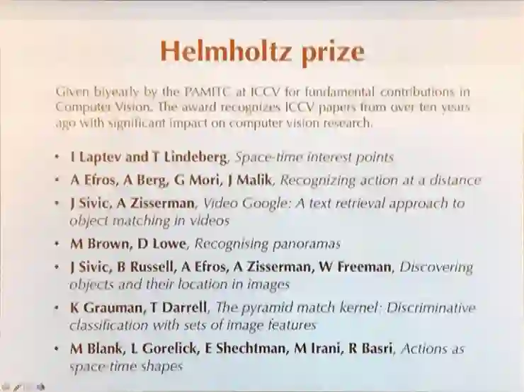 表彰超过10年前的ICCV上对计算机视觉研究做出巨大贡献论文的 Helmholtz奖颁发给了「Space-time interest points」、「Recognizing action at a distance」、「Video Google: A text retrieval approach to object matching in videos」、「Recognising panoramas」、「Discovering objects and their location in images」、「The pyramid match kernel: Discriminative classification with sets of image features」、「Actions as space-time shapes」7篇论文。