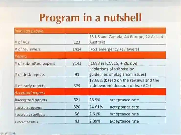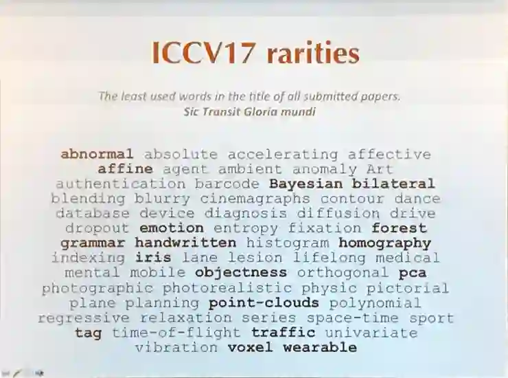 ICCV 作为计算机视觉的顶级会议,2017年共收到2143篇论文投稿,比上一届ICCV2015的1698篇增加了26.2%。共621篇被选为大会论文,录用比例28.9%;poster、spotlight、oral 比例分别为24.61%、2.61%和2.09%。