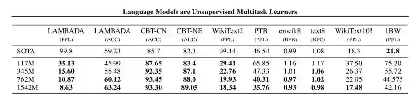 除了这个案例,GPT-2 更是一举刷新了多个语言模型任务的新记录!表1列举了 GPT-2 的战果,总共8个任务拿下7个最佳,而且在某些任务上将此前最佳甩开了好几个身位。表中,117M、245M、762M、和1542M表示同样方法不同参数量的 GPT-2 模型。