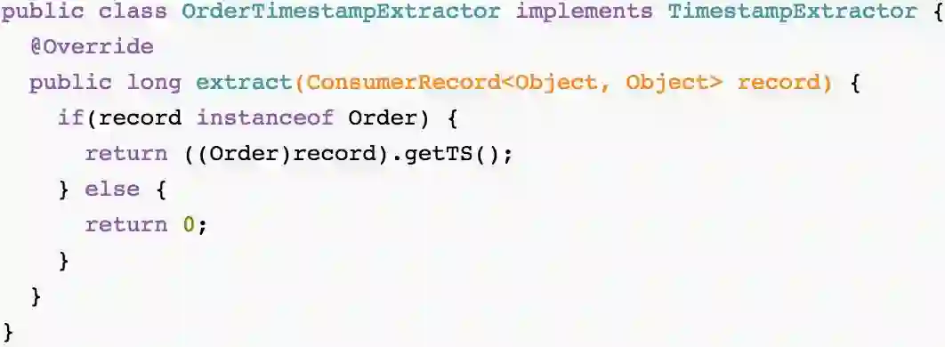 首先由于希望使用订单时间,而它包含在orderStream的Value中,需要通过提供一个实现TimestampExtractor接口的类从orderStream对应的Topic中抽取出订单时间。
