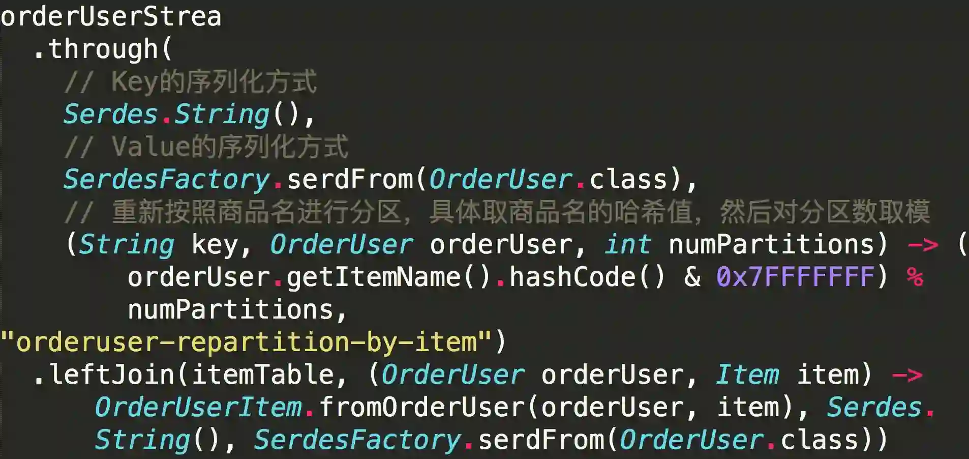 从上述代码可见,through时需要指定Key的序列化器,Value的序列化器,以及分区方式和结果集所在的Topic。这里要注意,该Topic(orderuser-repartition-by-item)的Partition数必须与itemTable对应Topic的Partition数相同,并且through使用的分区方法必须与iteamTable对应Topic的分区方式一样。经过这种through操作,orderUserStream与itemTable满足了Join条件,可直接进行Join。