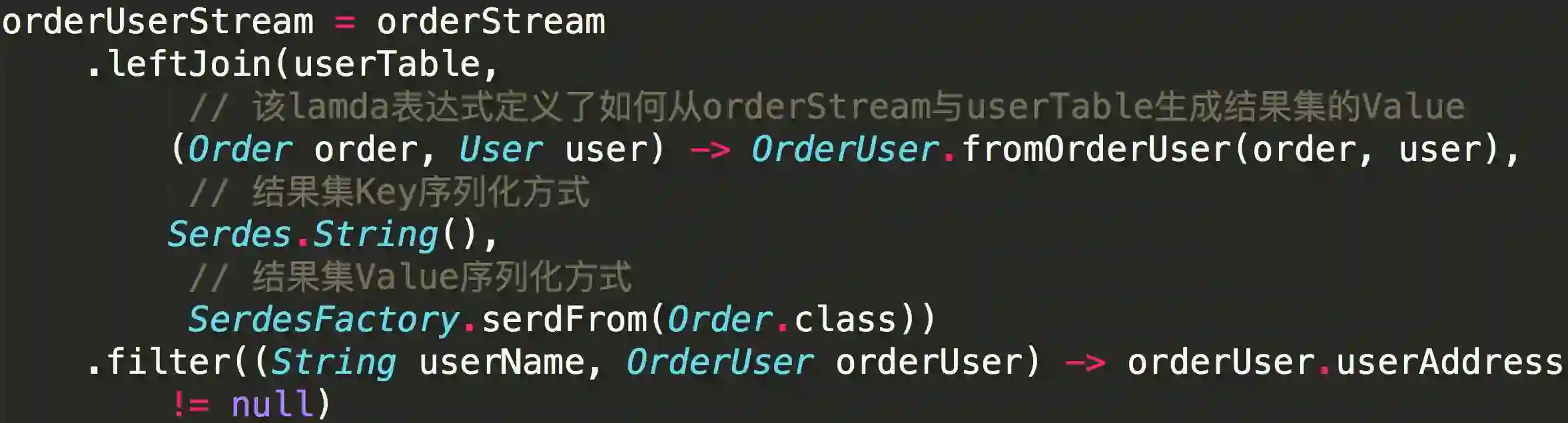 从上述代码中,可以看到,Join时需要指定如何从参与Join双方的记录生成结果记录的Value。Key不需要指定,因为结果记录的Key与Join Key相同,故无须指定。Join结果存于名为orderUserStream的KStream中。