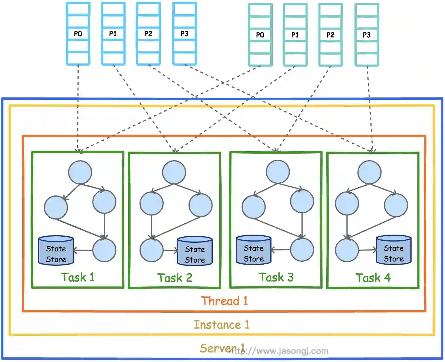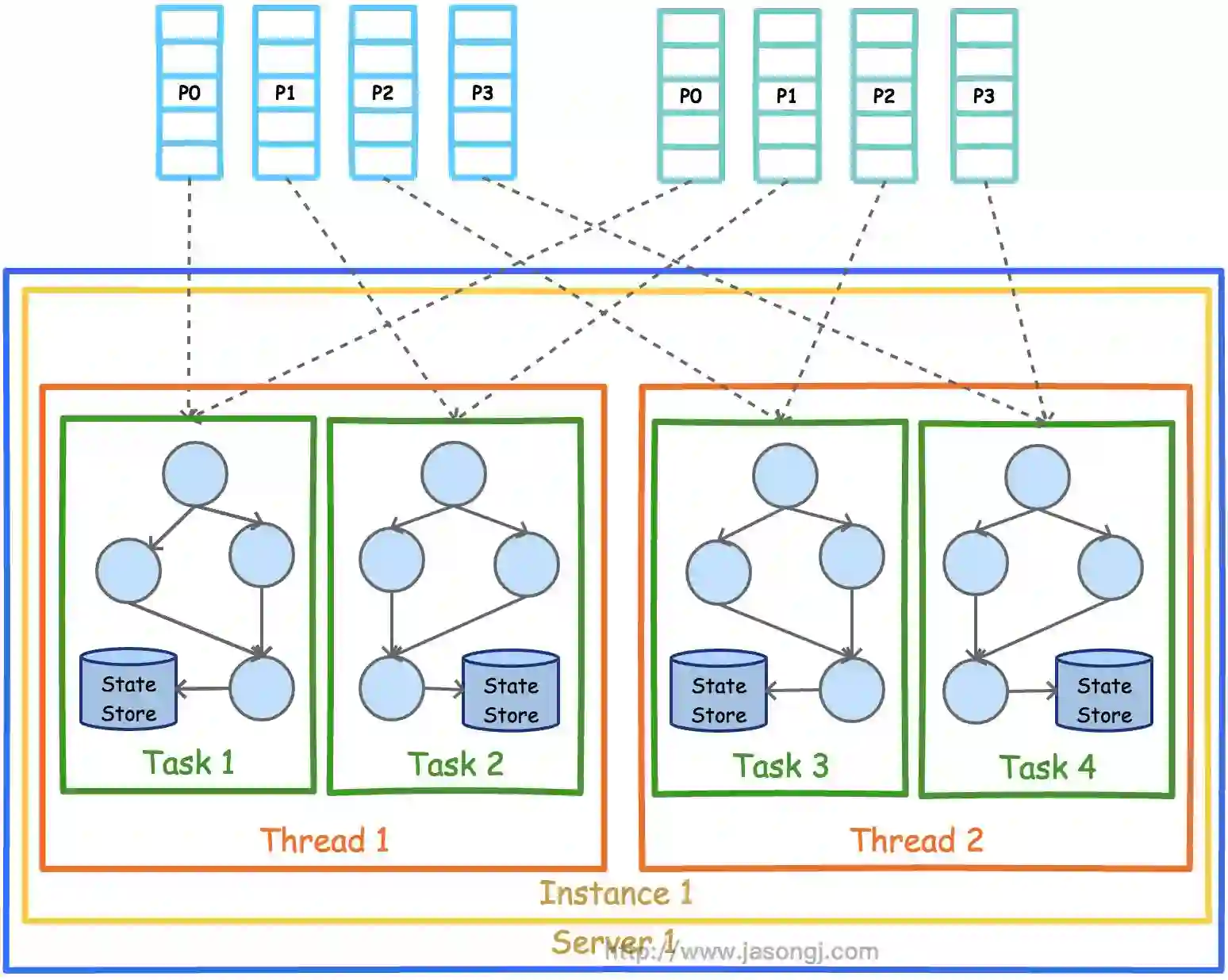 下图展示了在一个进程(Instance)中以2个Topic(Partition数均为4)为数据源的Kafka Stream应用的并行模型。从图中可以看到,由于Kafka Stream应用的默认线程数为1,所以4个Task全部在一个线程中运行。