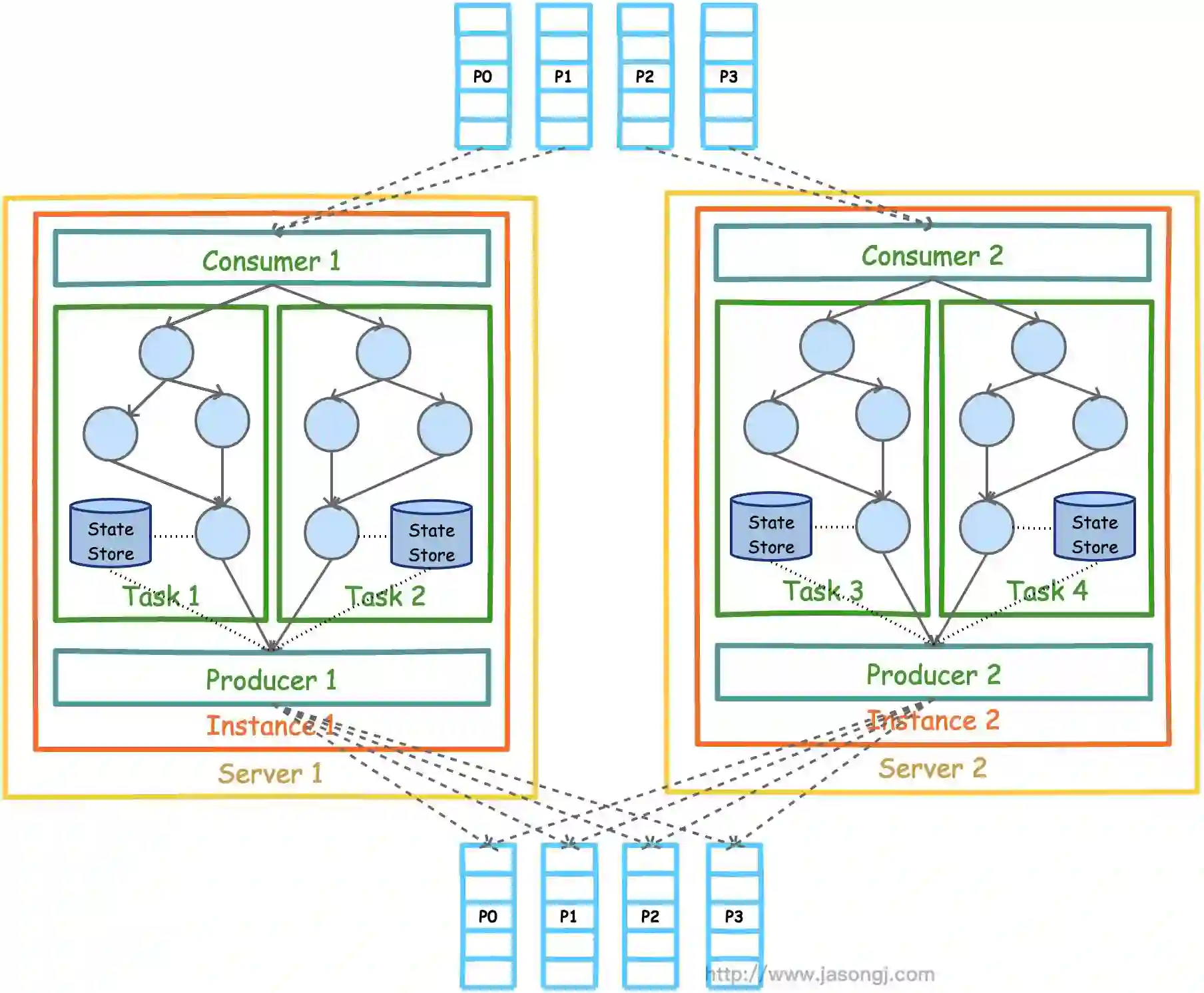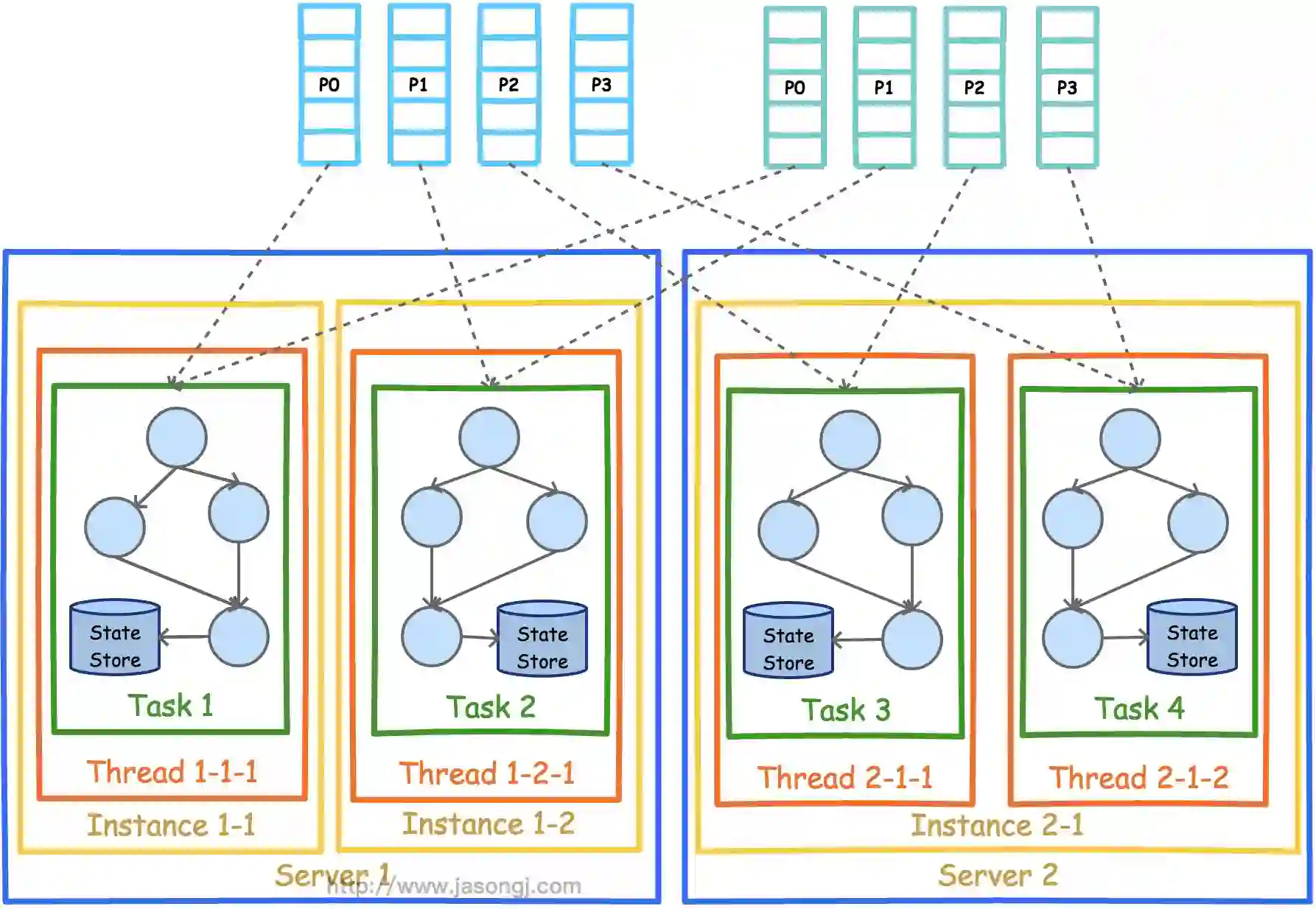 既然实现了多进程部署,可以以同样的方式实现多机器部署。该部署方式也要求所有进程的APPLICATION_ID_CONFIG完全一样。从图上也可以看到,每个实例中的线程数并不要求一样。但是无论如何部署,Task总数总会保证一致。