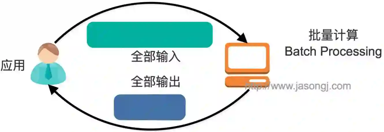 批量处理模型中,一般先有全量数据集,然后将计算逻辑应用于该全量数据集。特点是全量计算,并且计算结果一次性全量输出,在时间上是有界的。