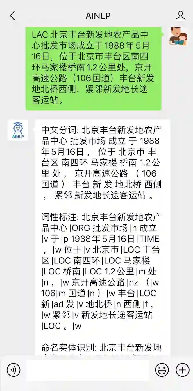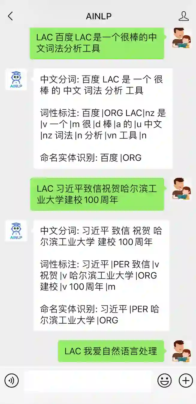 关于中文词法分析(中文分词、词性标注、命名实体识别)相关的工具,我们在之前已经多次提到过百度LAC(https://github.com/baidu/lac),除了在易用性上稍弱外,其他方面,特别在专名识别的横向对比中还是很亮眼的。最近百度NLP发布了LAC 2.0:开源!我知道你不知道,百度开源词法LAC 2.0帮你更懂中文,看完文章的第一感受就是易用性大大加强了,之前需要通过PaddleNLP或者PaddleHub调用lac,现在 "pip install lac" 后即可直接调用,相当方便。所以花了一点时间,把 LAC 2.0 单独作为一个接口部署在AINLP公众号的自然语言处理工具测试平台了,感兴趣的同学可以通过AINLP公众号后台对话极速体验LAC 2.0,输入"LAC 中文文本"直接获取百度LAC的中文文词、词性标注、NER识别结果: