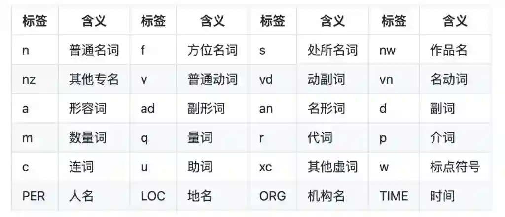 这里的输出格式为(word_list, tags_list),对应每个句子的切词结果word_list和每个词的对应词性标注的tags_list,其所用的词性标记集如下,包括4个常用的专名类别(PER, LOC, ORG, TIME):