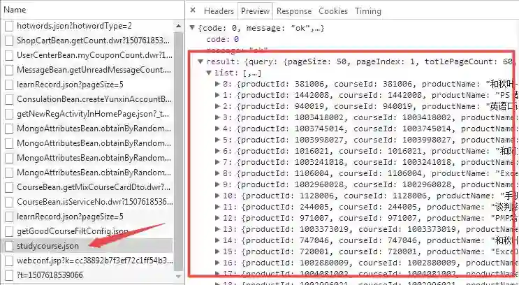 虽说动态网站数据请求也有GET方法的,但小编发现POST方法才是动态网页的主要的请求方式。受杜老师小魔方文章启发,小编也试一下这个网页上的效果。登录网易云课堂账号,右键开发者工具,直接定位到XHR,查找课程数据属于哪个url。通过尝试和preview,可以发现课程信息都被封装在一个studycourse.json的文件中: