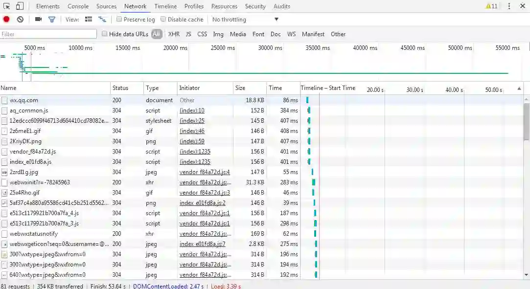 很早之前圈子里就看到过用Python抓取自己微信好友数据的案例分享,今天便以微信网页版为例,探一探其网页结构。首先登录个人微信网页版,右键打开web开发者工具,下来一大堆请求: