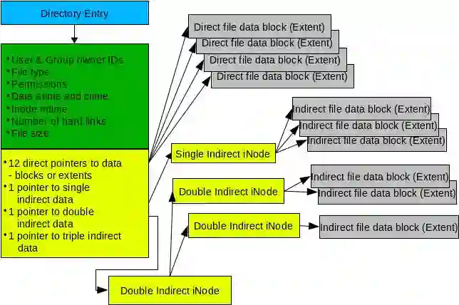 间接节点是文件系统中的正常数据块,它仅用于描述数据而不用于存储元数据,因此可以支持超过 15 个条目。例如,4K 的块大小可以支持 512 个 4 字节的间接节点,允许单个文件有 12(直接)+ 512(间接)= 524 个扩展盘区。还支持双重和三重间接节点,但我们大多数人不太可能遇到需要那么多扩展盘区的文件。