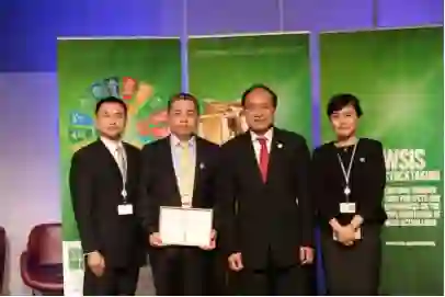 国家信息无障碍公共服务平台副主任黄畅(左一)、中国互联网协会会议部主任赵耀(右一)一行颁发“2017信息社会世界峰会”项目大奖