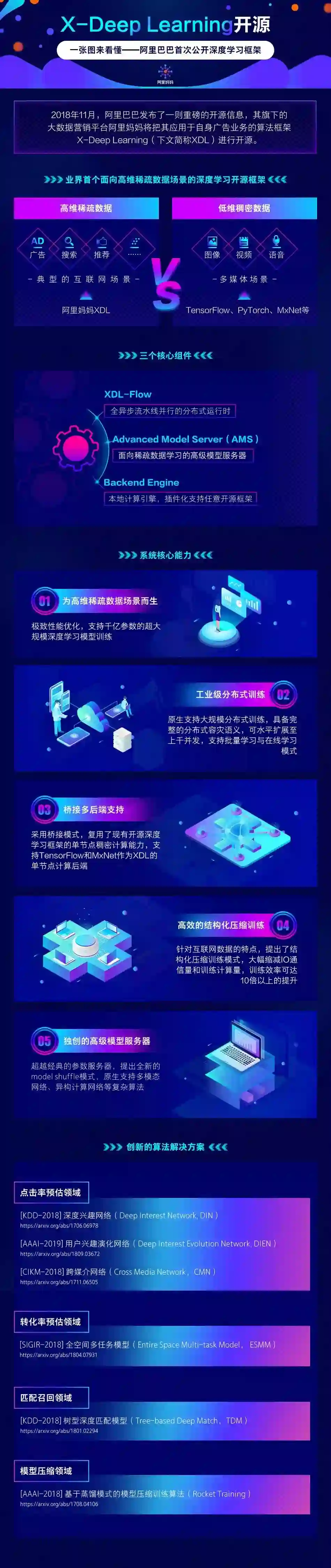 阿里巴巴内部透露将开源内部深度学习框架 X-DeepLearning的计划,这是业界首个面向广告、推荐、搜索等高维稀疏数据场景的深度学习开源框架,可以与TensorFlow、PyTorch 和 MXNet 等现有框架形成互补。