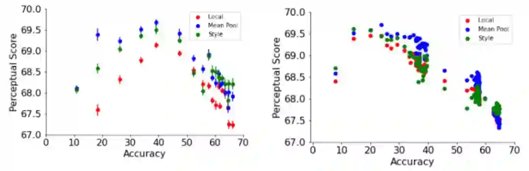可以看到,更好的 ImageNet 分类器在一定程度上实现了更好的感知评分,但超过某一阈值,提高准确性反而会降低感知评分,分类器的准确度适中(20.0-40.0) ,可以获得最佳的感知评分。