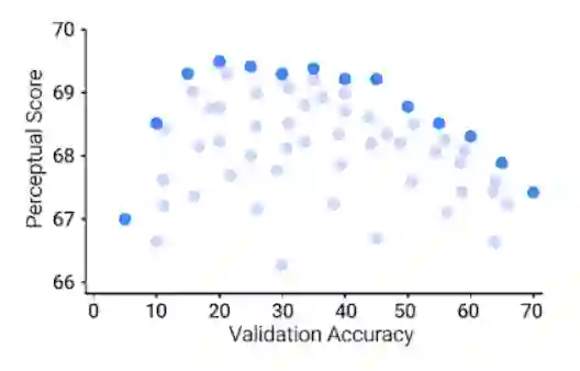 对于每个超参数,存在一个最优精度,提高精度可以改善感知评分,但这个最优值相当低,并且在超参数扫描中很早就可以达到。