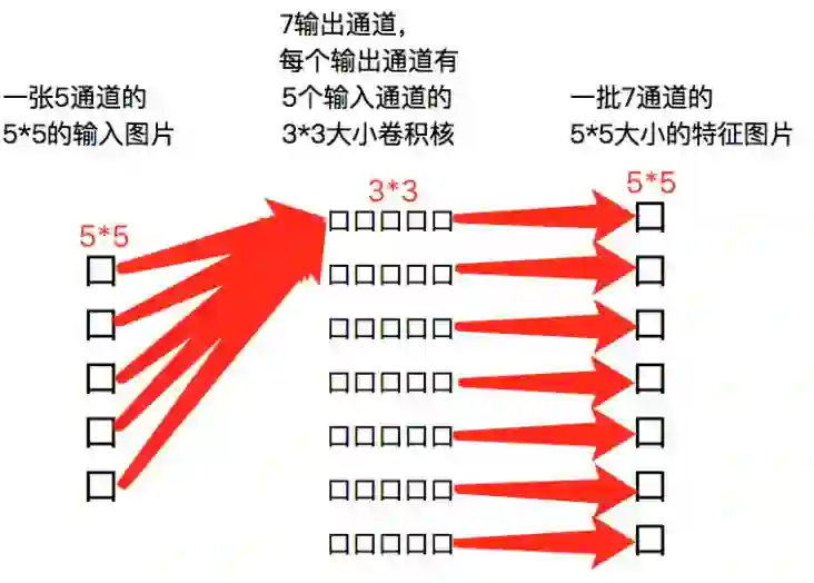 5输入通道、7输出通道的3*3大小的卷积核:filter = [3, 3, 5, 7];