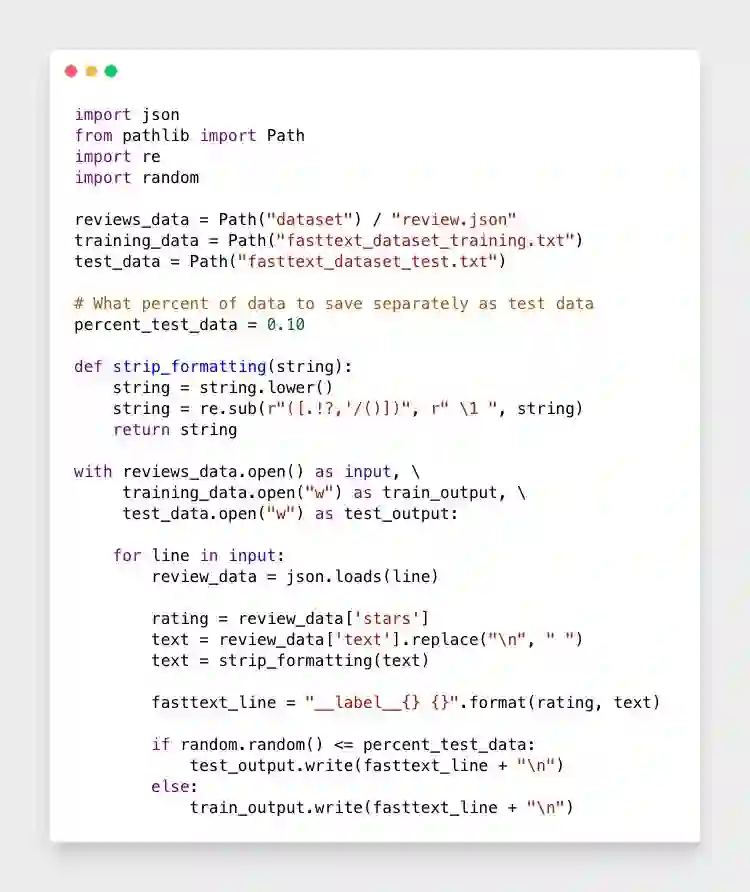 这是一段简单的 Python 代码,它将读取 reviews.json 文件并以fastText格式写出一个文本文件: