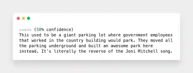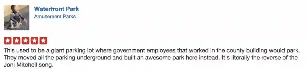 再举个例子。下图是 Adam 在国外的“58 + 点评”网站 Yelp 上,对一个公园的评价:
