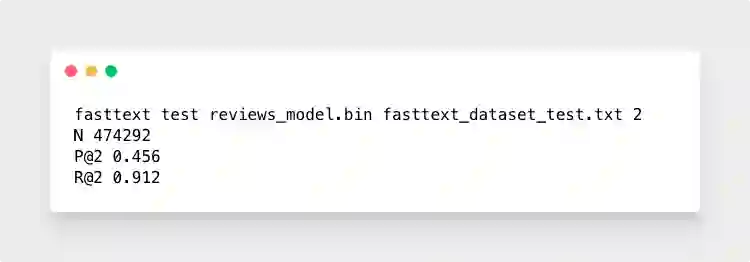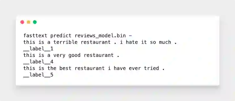 还可以通过运行 fastText 的predict命令然后键入自己的评论,以交互方式试用模型(注意,输入的格式跟外面训练数据要保持一致,全部小写并且标点前面加空格)。