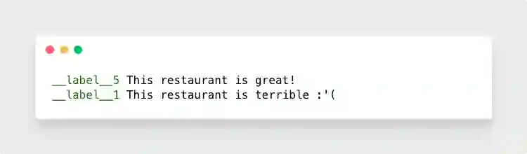 fastText需要一个文本文件,每行文本都在一行上。每行的开头都需要有一个__label__YOURLABEL的特殊前缀,用于为该段文本分配标签。