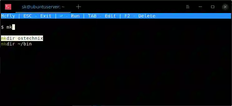 如你所见,我已经使用过 mkdir 这个命令两次。假如你想从这些命令建议中执行其中之一,只需使用上下键来选择它,然后敲击回车键来执行它就可以了。假如你想编辑其中一个命令,则需要先选择它,然后敲 TAB 键将这个命令放置到终端中,最后在运行它之前更改它就行了。要从历史中删除已经选择的命令,按 F2 即可。