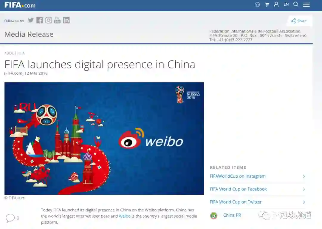 FIFA的入驻,再一次证明中国市场的潜力与微博在顶级体育赛事的传播链中举足轻重的地位。