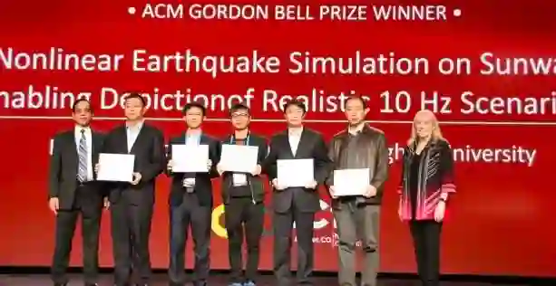 「非线性地震模拟」是由清华大学地球系统科学系、计算机系与山东大学、南方科技大学、中国科学技术大学、国家并行计算机工程技术研究中心和国家超级计算无锡中心等单位共同完成。成果发表于今年的全球超级计算大会上,论文题目为《基于神威太湖之光的 18.9-Pflops 非线性地震模拟:实现对 18Hz 和 8m 情景的描述》(18.9-Pflops Nonlinear Earthquake Simulation on Sunway TaihuLight: Enabling Depiction of 18-Hz and 8-Meter Scenarios)。