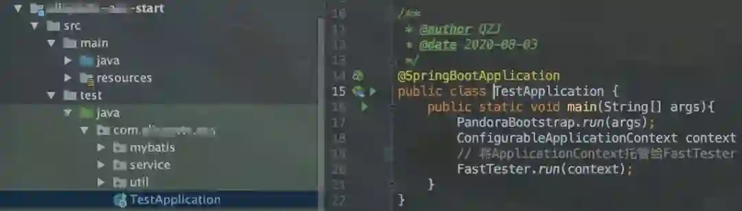 /*** @author QZJ* @date 2020-08-03*/public class TestApplication {public static void main(String[] args){PandoraBootstrap.run(args);ConfigurableApplicationContext context = SpringApplication.run(TestApplication.class, args);// 将ApplicationContext传给FastTesterFastTester.run(context);}}