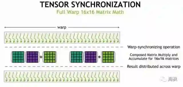 这是NVIDIA在Volta张量操作上展示的另一个视图,展示了如何使用较低的精度FP16输入并到达FP32输出。