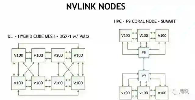 GV100将有多达6个NVLINK连接,它允许一些拓扑结构,以方便GPU与GPU连接。这当然是一种比我们在PCIe交换机中看到的得到更多GPU间带宽的方法。单根v双根深度学习的GPU到GPU系统。