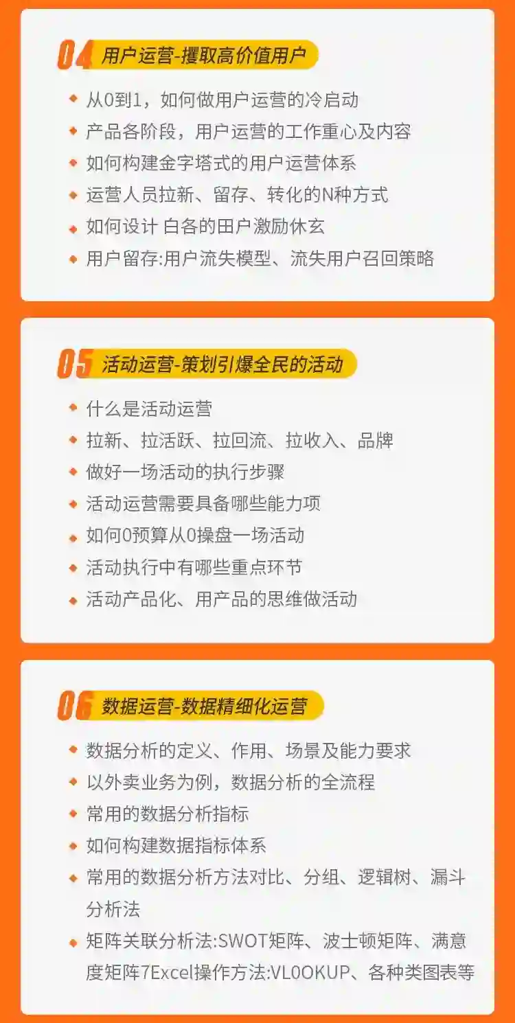 课程有八大运营知识板块,可以让你学到核心运营岗位必备的知识、技能,让你对所有运营岗位都有一套系统的工作,并有能力深耕2-3个领域,减少能力短板,打造核心竞争力。