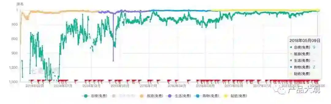 在我们诸多的分析中,小红书APP用户增长速度虽然不是最快的,但是,小红书的增长仍然呈现一个近乎完美的曲线,通过对产品下载增长曲线图和产品分类排名变化进行分析,我们可以将小红书的发展分为3个阶段: