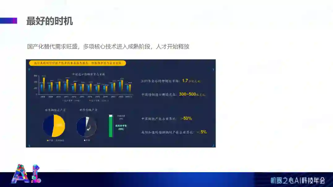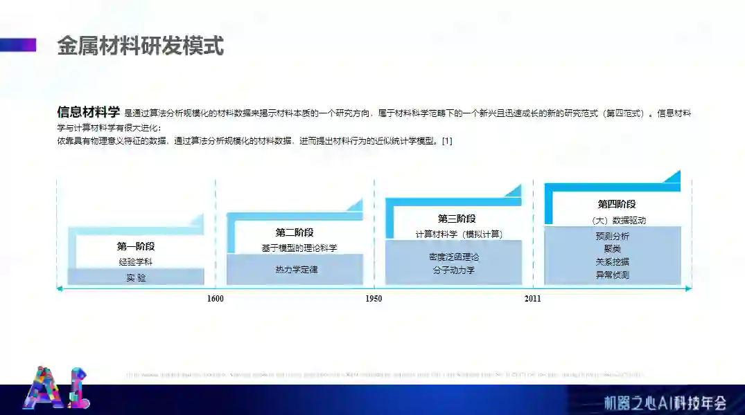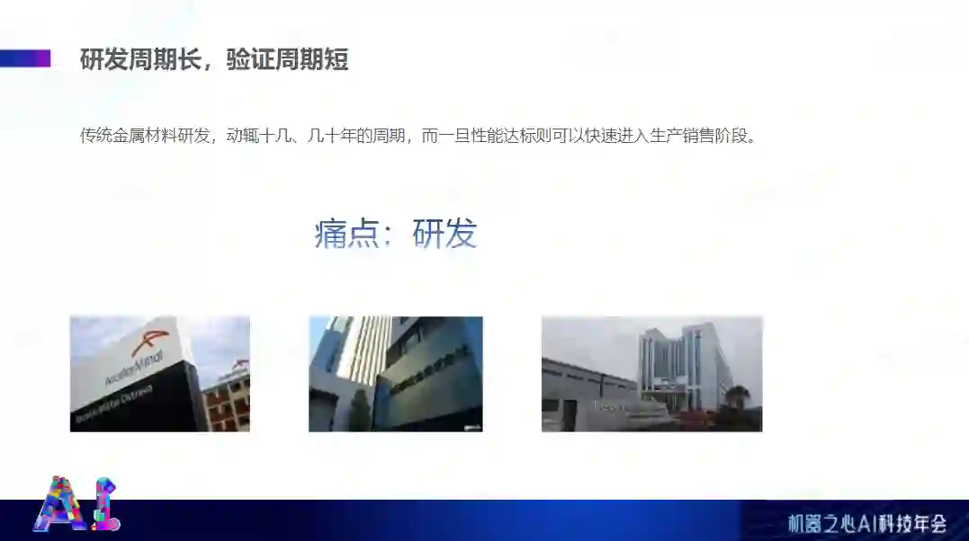 编辑/凯霞 3 月 23 日,在机器之心 AI 科技年会上,创材深造创始人兼 CEO 王轩泽在「AI x Science 论坛」分享了主题为《AI + 金属材料:更适合产业落地的方向》的相关内容。分享就 AI 产业落地过程中可能遇到的问题进行了讨论,包括精度陷阱;行业壁垒并非技术,传统大厂转型自研;某些 toB 领域存在的一些问题;黑盒性质严重,客户不认可,短期内取代不了关键岗位人员;算法效果惊艳但落地艰难等精彩观点。王轩泽介绍说,AI 赋能金属材料的产业化,可以有效地规避或解决上述 AI 落地中的难点问题。从另一方面讲,高端金属材料是一个经常被忽视的市场,随着产业升级和战略转型,国产化替代的需求被迅速放大。高端金属领域最主要的难点在于过长的研发周期和过大的研发投入,因此使用 AI 赋能新材料的研发成为了弯道超车的最优解。演讲视频回顾(点击「阅读原文」也可观看):https://www.bilibili.com/video/BV1SL4y177nR?t=7.0以下为王轩泽在机器之心 AI 科技年会上的演讲内容,ScienceAI 进行了不改变原意的编辑、整理:大家下午好!非常感谢机器之心的邀请,非常高兴能够入选机器之心 2021 年度《最具潜力 ScienceAI 创业公司 TOP 10》企业名单。首先,简单自我介绍一下,我通过计算机物理竞赛保送到上海交大,在交大读了本硕,主修人工智能方向。毕业之后去了科创板 AI 第一股的虹软科技,主要做的是图像领域的人工智能算法,帮助国内外头部的厂商做摄像头内置的图像算法落地。离职之后自己创办了敏视科技,主要做工业检测项目,取得了一些小成绩。后来参与了一个 AI+小分子药物的创业项目,具体算法框架都是由我来开发的。现在致力于 AI+基础材料的研发。我是一个创业者,同时也是一个比较资深的算法工程师,所以,很多年在一线从事这些 AI 落地的项目过程中,也是看到了一些 AI 落地的问题。今天这个分享也是希望跟大家分享一下我遇到的或者看到的问题,以及我们为什么最终选择了 AI+金属材料的领域做深入的研究。