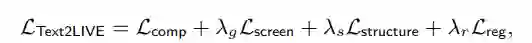 生成器的的优化函数为多个损失项之和,每个损失项都是在CLIP空间中定义,包括主要的目标Composition loss,能够反映图像和目标文本提示之间的匹配程度;Screen loss,应用于生成的编辑层中,主要技术是在纯绿色背景上合成一个噪音背景图像,判断抠图准确度;Structure loss,保证替换的纹理和显示效果能够保持原始目标的空间分布和形状。