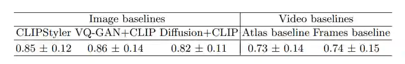 在视频的实验中,参与者需要选择「质量更好、更能体现文本的视频」,实验数据包含19个(视频,文本)对和2400个用户的判断结果。结果可以看到,Frames基线模型产生了时间线不一致的结果,而Atlas基线的结果更一致,但在生成高质量纹理方面表现不佳,经常产生模糊的结果。