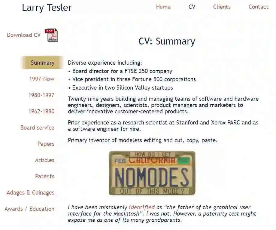 与此同时,Tesler 还是“无模式”计算概念的拥护者,这种概念主张程序不应具有不同的“模式”,即所有操作始终对用户可用,而非要求用户输入特定的模式来执行它们。一直以来,Tesler 坚信“无模式”,以至于他的个人网站的网址都是以此来命名:nomodes.com。