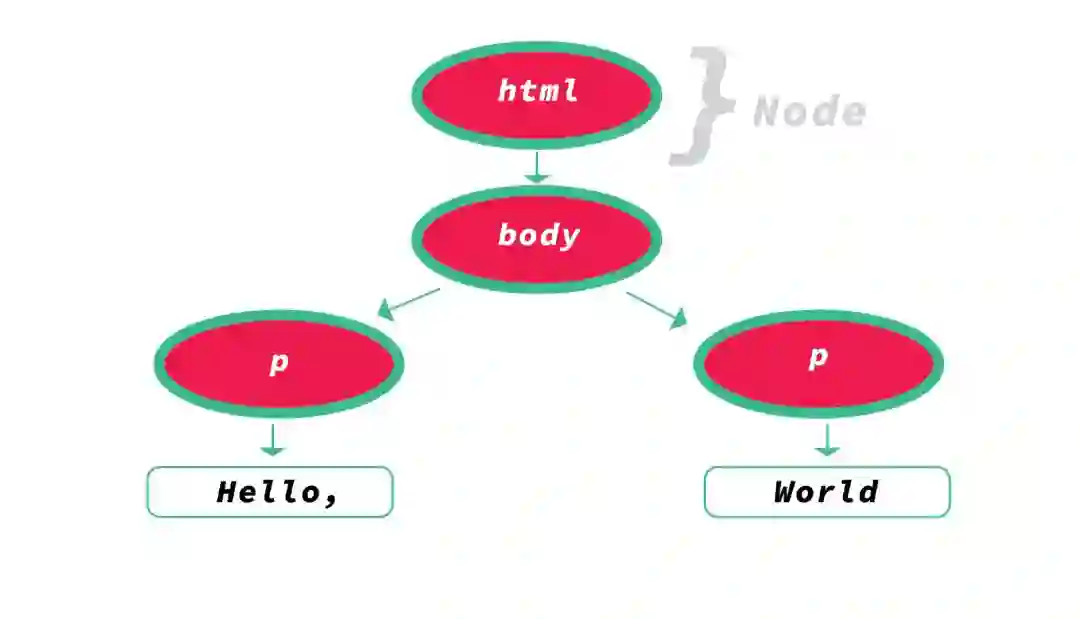 现在,让我们看一下最后一点。在创建好之后,这些节点将被链接到称为 DOM 的树数据结构中。DOM 建立起了父子关系、相邻兄弟关系等。在这个 DOM 对象中,每个节点之间都建立了关系。现在,这是我们可以使用的东西了。