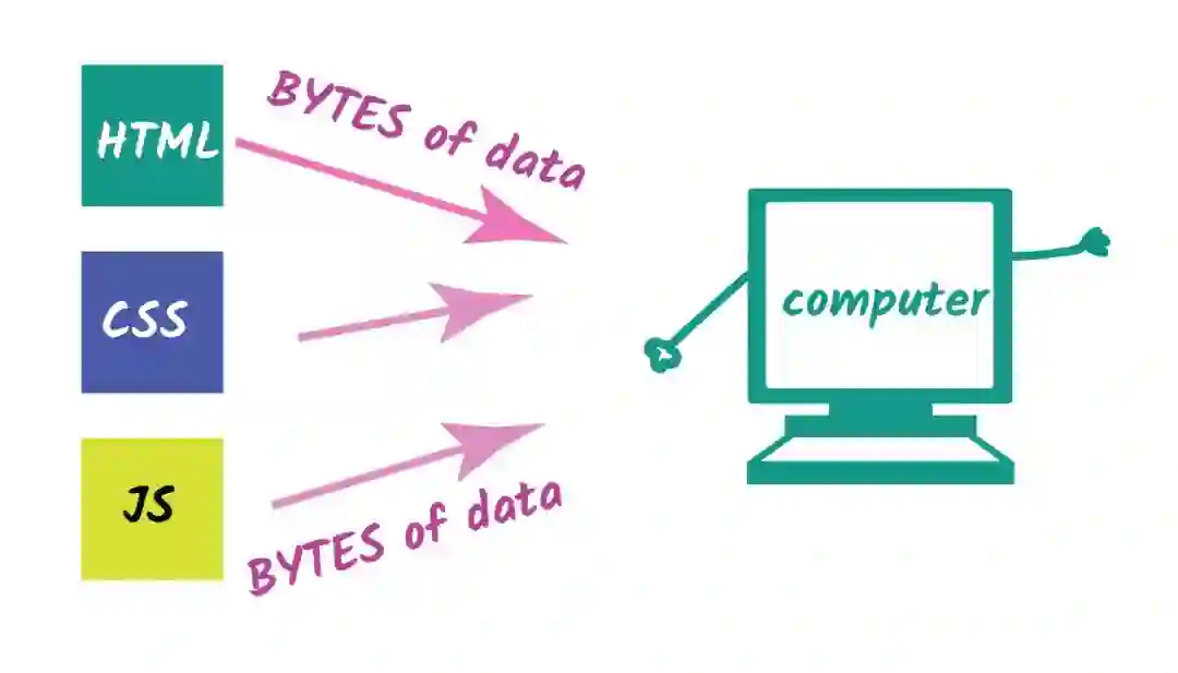 我想说的是,当你编写一些 HTML、CSS 和 JS,并试图在浏览器中打开 HTML 文件时,浏览器会从你的硬盘(或网络)中读取 HTML 的原始字节。