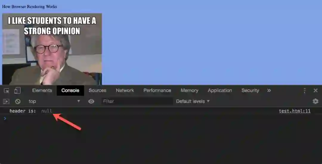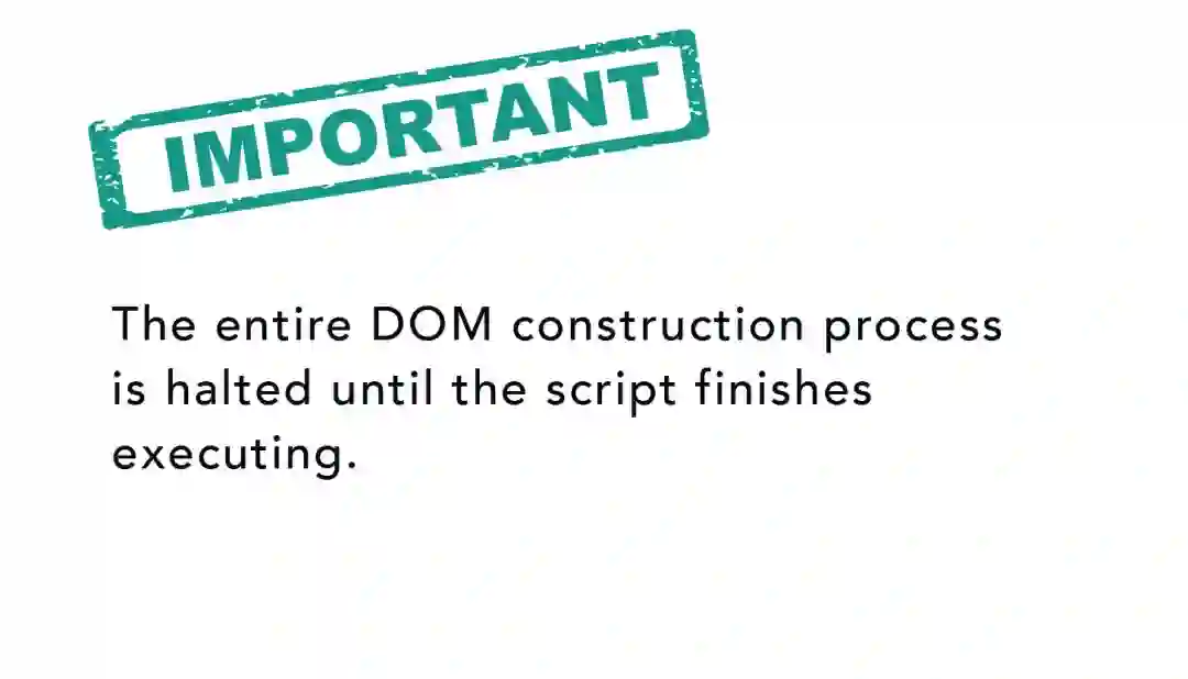 为什么会这样?很简单。当 HTML 解析器正在构建 DOM 时,发现了一个脚本标签。此时,body 标签及其所有内容还没有被解析。DOM 构造将停止,直到脚本执行完成: