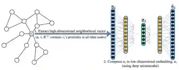 SDNE(Structural Deep Network Embeddings) 将节点的相似性向量 直接作为模型的输入,通过 Auto-encoder 对这个向量进行降维压缩,得到其向量化后的结果 。其损失函数定义为: