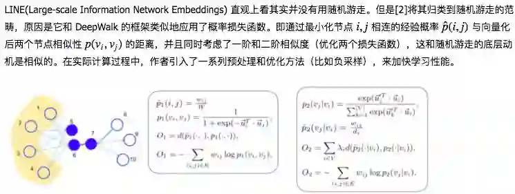 DeepWalk 是最早提出的基于 Word2vec 的节点向量化模型。其主要思路,就是利用构造节点在网络上的随机游走路径,来模仿文本生成的过程,提供一个节点序列,再套用 Word2Vec 对每个节点进行向量化表示。因为知道了节点 V 的前 k 个节点和后 k 个节点,就能很好地将网络邻居结构存入向量中。其目标就是最大化
