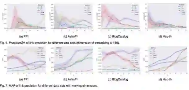 从 Top k 预测准确性来看,node2vec 模型在 BlogCatelog 数据中表现最好,其他数据集就比较一般(在 PPI 的 Top 表现也不错)。HOPE 模型在 k 比较大时,效果一般在中上位置,比较稳定。