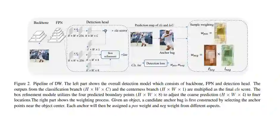 标签分配(Label Assignment,LA)是目标检测中重要的一个步骤,其目的是为每个训练样本分配正样本和负样本的损失权重。现有LA研究主要关注正样本权重函数的设计,却直接使用正样本权重作为负样本的权重,这种做法一定程度上限制了检测器的学习能力。本文探索了一种新的标签分配范式,称为双加权标签分配(DW),以分别指定正样本和负样本的损失权重。作者认为:正样本权重由其分类和定位之间的一致性程度确定,而负样本权重为负样本的概率和其以负样本为条件的重要性。基于这一动机,本文首先分析了目标检测中的评价指标,确定正/负权重的关键影响因素,然后提出了DW算法。这种加权策略为区分重要的和不重要的样本提供了更大的灵活性,从而使训练更有效的目标检测器成为可能。实验结果表明通过引用DW,FCOS-ResNet-50在COCO上可以达到41.5%的mAP,优于其他现有的LA方法。
