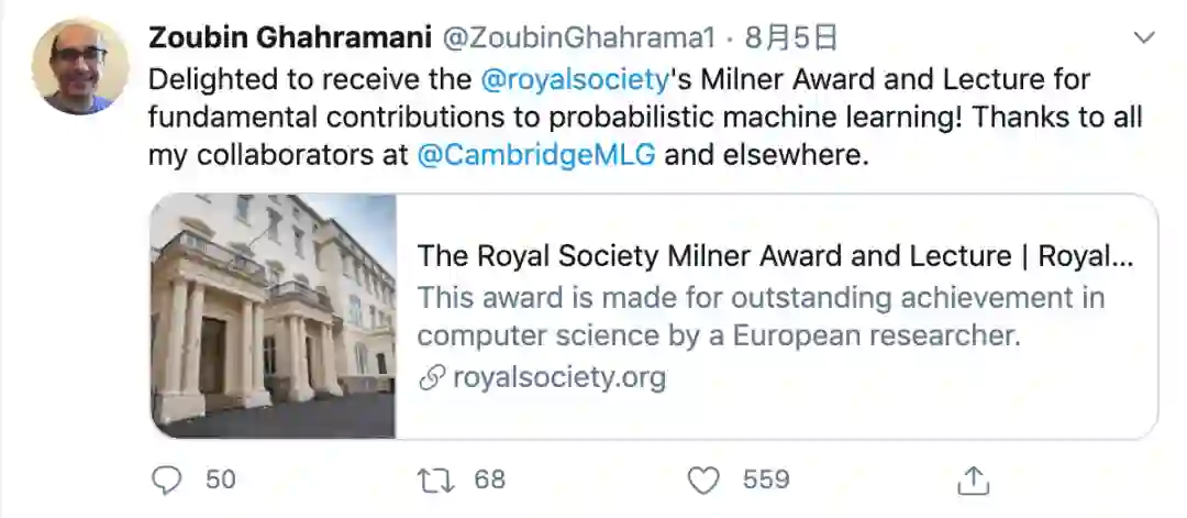 获奖后,Zoubin Ghahramani 在社交媒体上表达了自己的心情和对合作者的感谢: