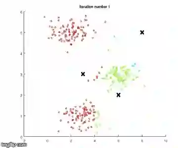 从图上看,这一步将中心点向步骤1中相似的分组进行移动。更准确地说,就是取所有与中心点相似或属于该分组的点的平均值(步骤1的分组),来计算每个中心的新位置。