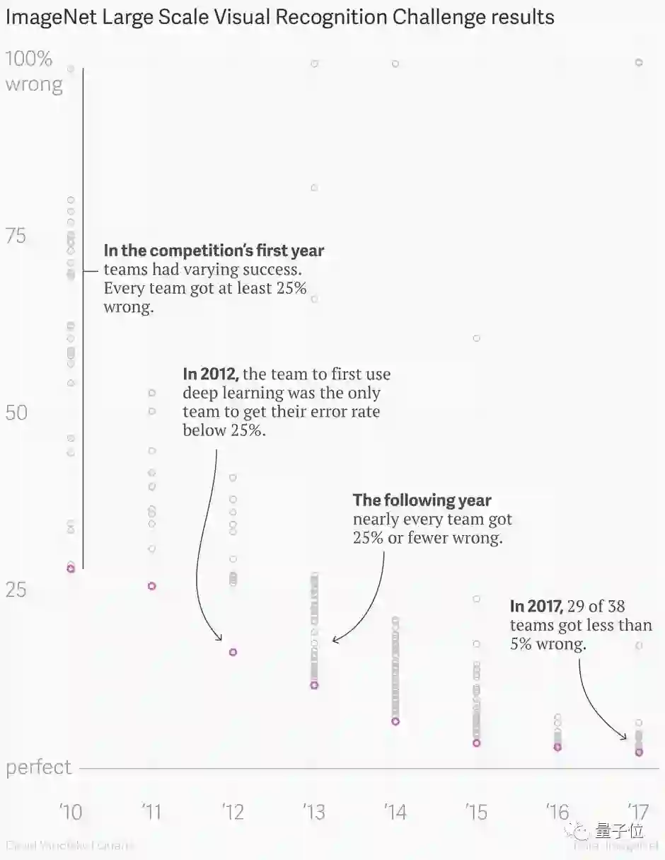 由此制作的数据集名为ImageNet,它作为论文于2009年发布时,还只能以海报的形式缩在迈阿密海滩大会的角落里,但却很快成为了一场年度竞赛:看看究竟哪种算法能以最低的错误率识别出其中的图像所包含的物体。很多人都将此视作当今这轮人工智能浪潮的催化剂。